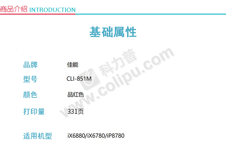 佳能 CANON 墨盒 CLI-851M 打印量331页 (品红色)