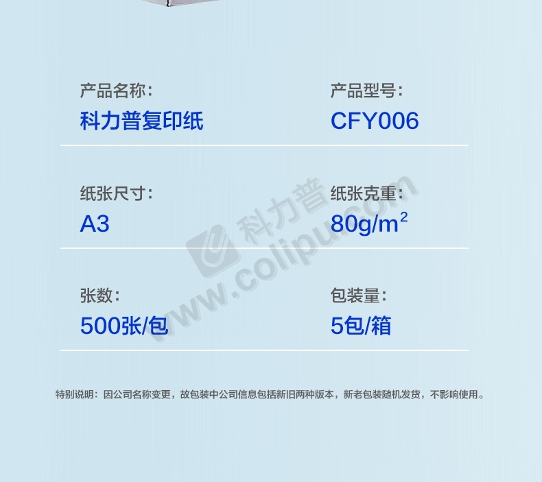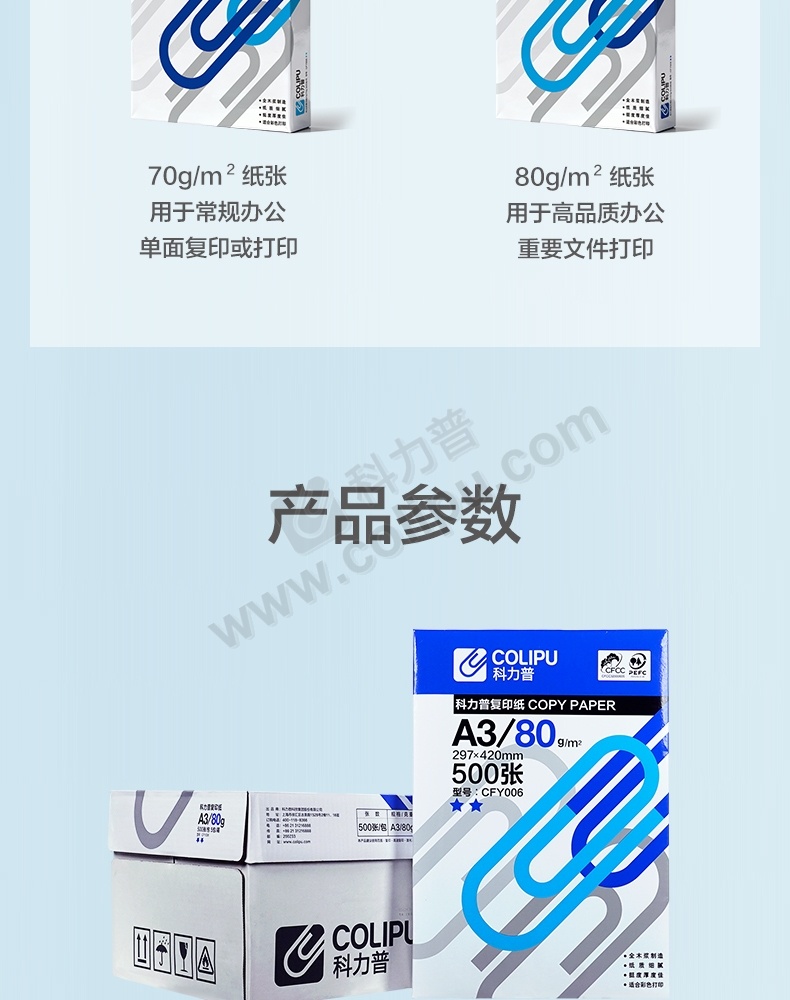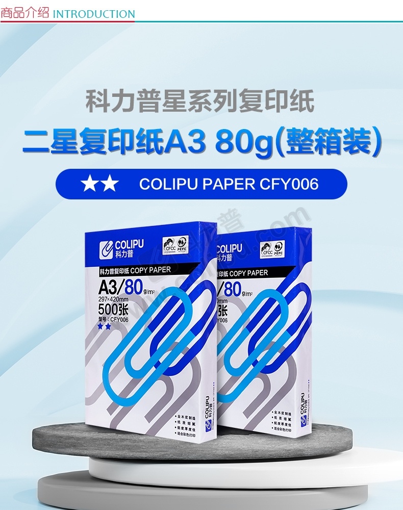 科力普 COLIPU 复印纸 2星 CFY006 A3 80g 500张/包 5包/箱 (大包装)PEFC认证