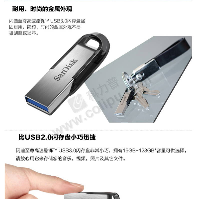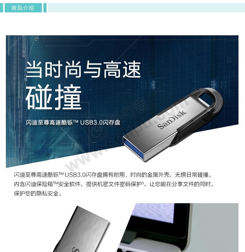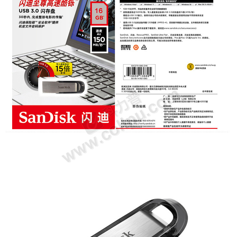 闪迪 SANDISK U盘 酷铄 SDCZ73-016G-Z35 16GB (银色) USB3.0 读取速度高达130MB/s 金属材质 安全加密软件