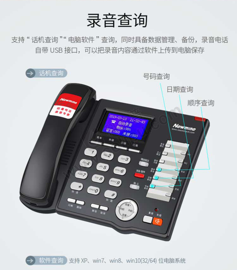 纽曼 录音电话 HL2007TSD-908R 芯片/U盘双存储行业录音电话 黑色