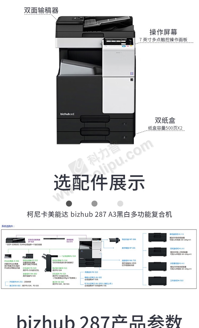 柯尼卡美能达 KONICA MINOLTA A3黑白数码复印机 bizhub 287 (双纸盒、双面输稿器、工作台)