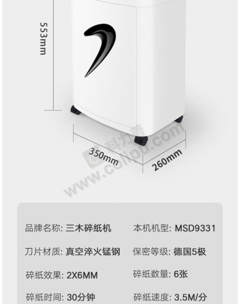 三木 锰钢侠碎纸机 MSD9331 20L 5级保密 (白色)