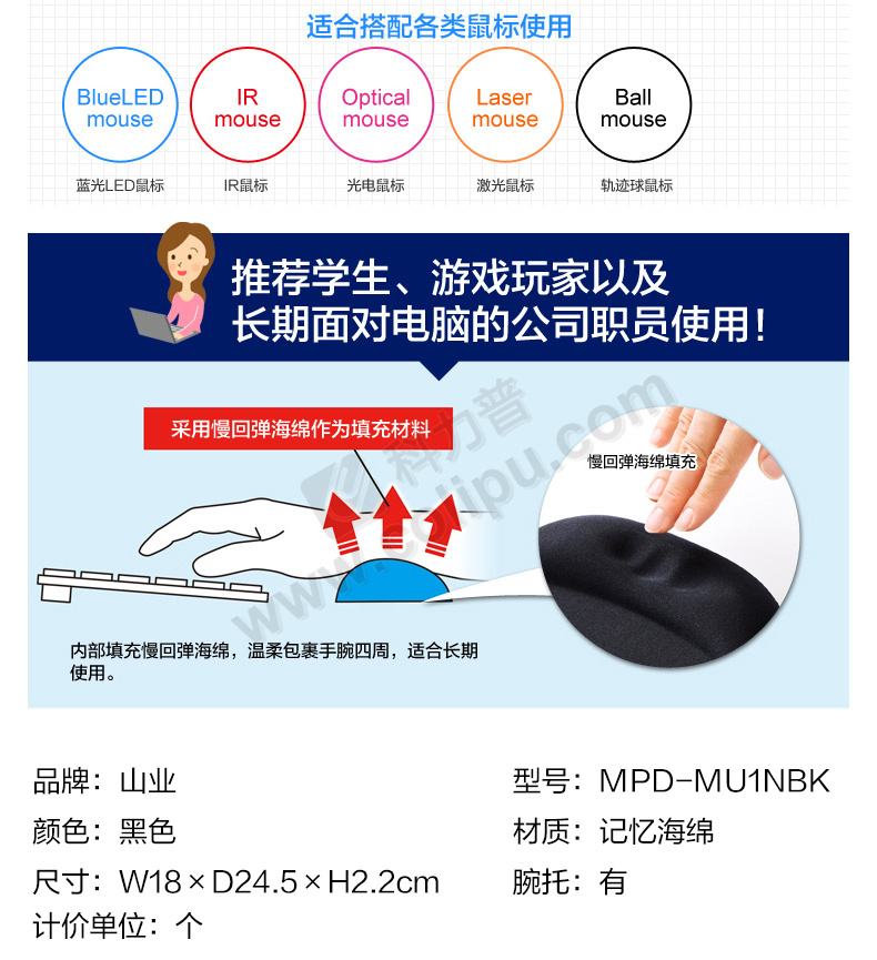 山业 SANWA 慢回弹记忆海绵鼠标垫 MPD-MU1NBK 180*245*22mm (黑色)