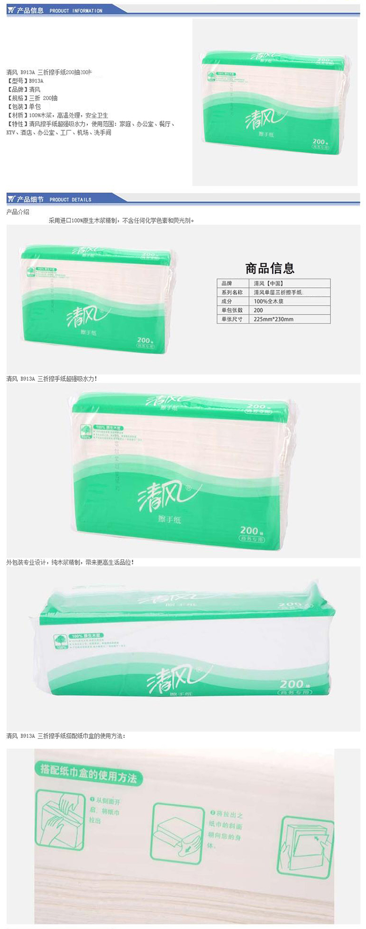 清风 擦手纸 B913A型号:B913A 绿色包装 225*230 200张/包 单包售