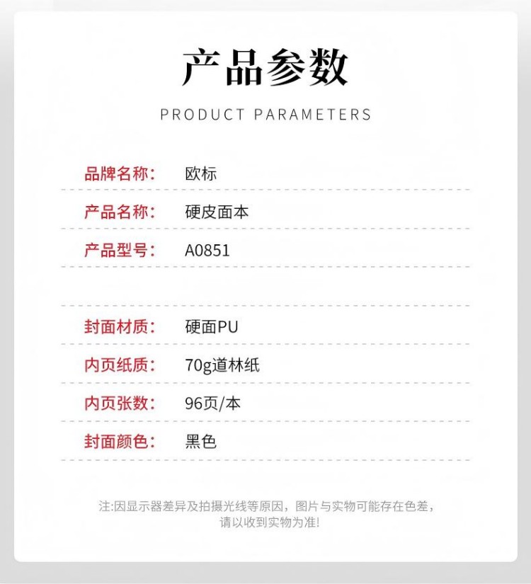 商品简介 32K 硬面PU 内页96页 70g道林纸 黑色