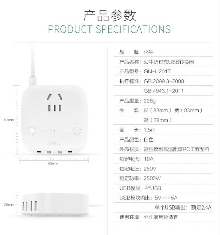 公牛 转换器 GN-U201N 1.5m 4USB 1孔 2017年新国标 白色