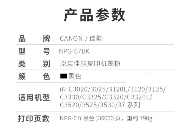 商品简介 大容量 790克 适用于iR-ADV C3330/3325/3320/3320L 36000页