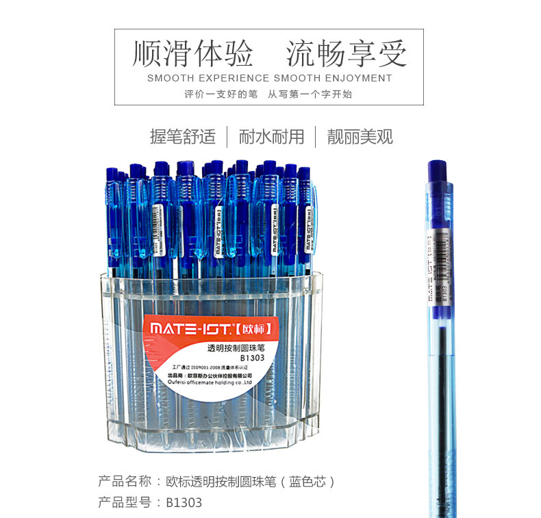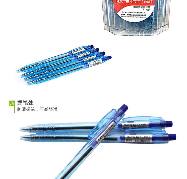 欧标 透明按制圆珠笔 B1303 0.7mm 蓝色芯 1/60/40 蓝色颜色:蓝色、规格:1支