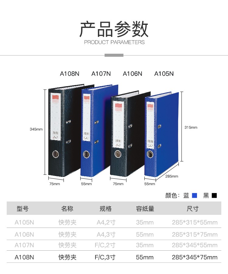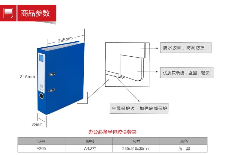 齐心 半包胶快劳夹 A206 A4 3寸 1/10/40 蓝色颜色:黑色、规格 :A4 2寸 A205