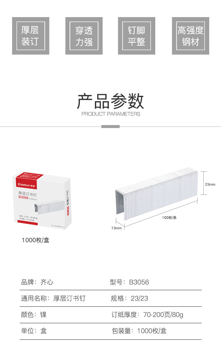 齐心 订书针B3056 23/23厚型 210页 1/5/100 镍