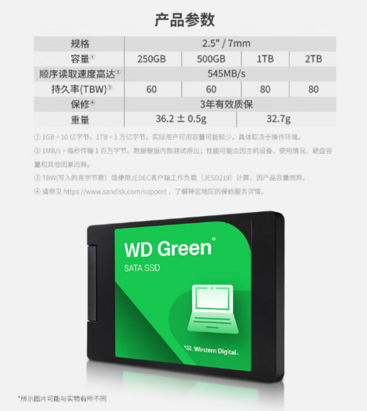 西部数据 WD WDS200T2G0A SSD固态硬盘 2TB SATA3.0接口 Green系列 计价单位:个