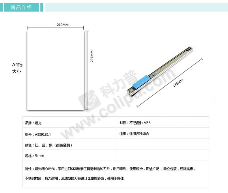 晨光 M&G 小号金属美工刀 ASS91314 9mm (红色、蓝色、黑色) 24把/盒 (颜色随机)