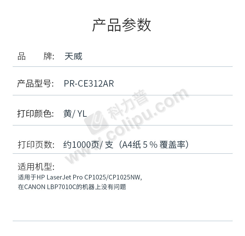 天威 PRINT-RITE 激光碳粉盒 PR-CE312AR TRH809YPEJ 1000页 (黄色) 专业装 带芯片