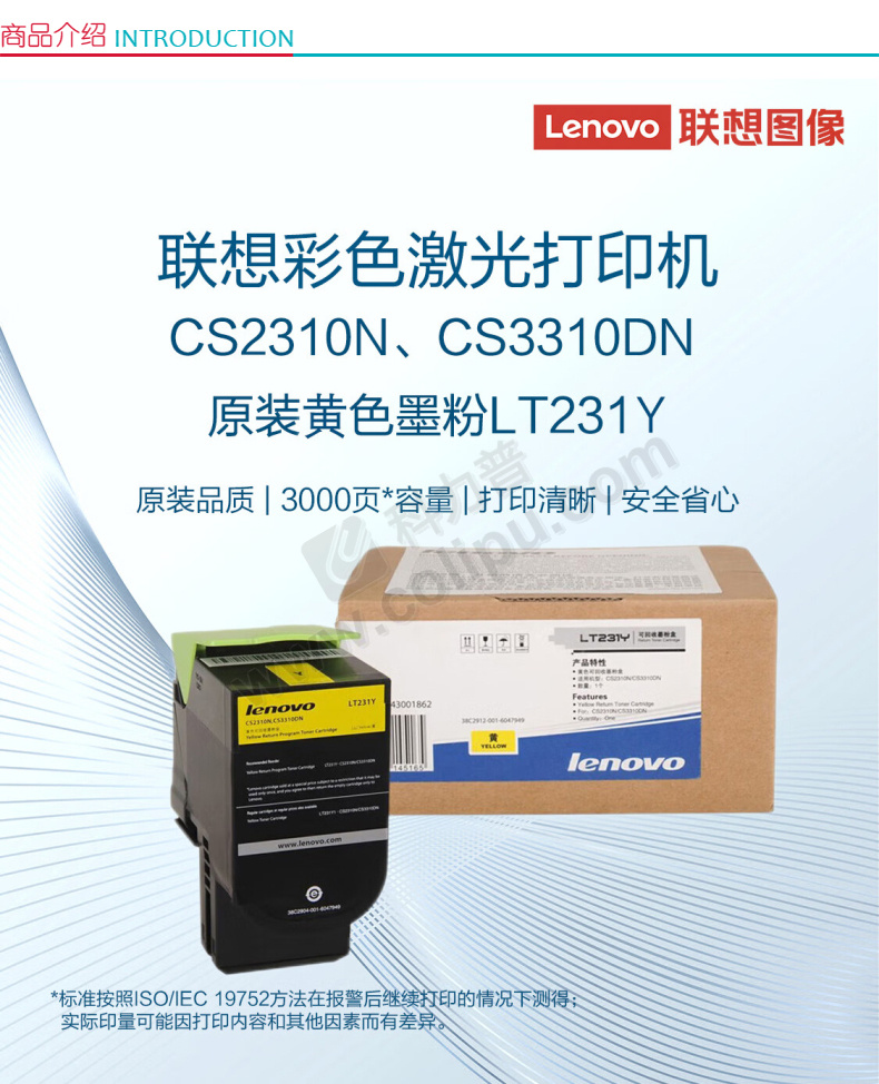 联想 LENOVO 墨粉盒 LT231Y 3000页 (黄色) (含芯片)